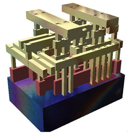 在开始前,我们要先认识IC芯片是什么。IC,全名集成电路(Integrated Circuit),由它的命名可知它是将设计好的电路,以堆栈的方式组合起来。藉由这个方法,我们可以减少连接电路时所需耗费的面积。下图为 IC 电路的 3D 图,从图中可以看出它的结构就像房子的梁和柱,一层一层堆栈,这也就是为何会将 IC 制造比拟成盖房子。
